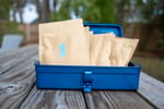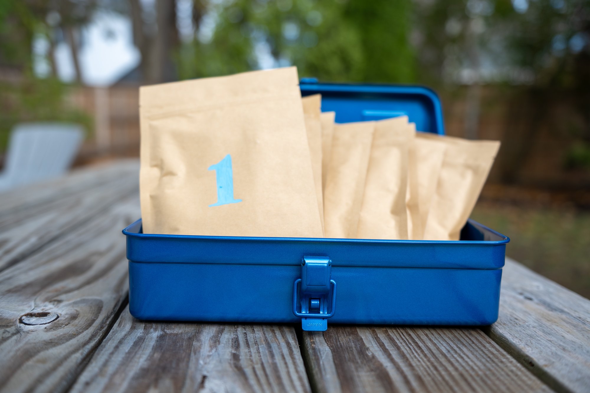 Your eight coffees arrive in a Japanese-made Trusco T-320Y toolbox in blue, screen-printed with our logo. Trusco has been making these steel toolboxes since the 1960s - they're designed to last decades and look better with age. Long after the coffee's gone, you've got a perfect storage box for brewing gear, desk supplies, or whatever else needs a proper home.